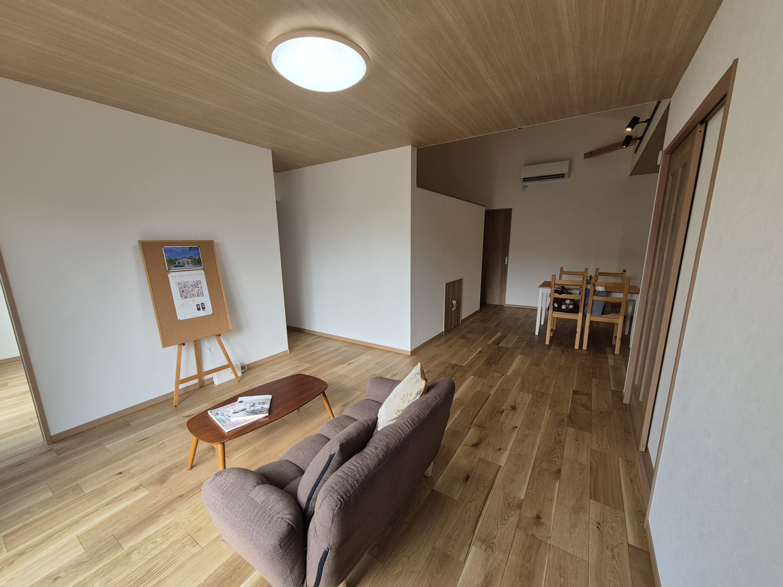 日当たり良好なLDK。ダイニング部分を勾配天井にして開放感ある空間になっています。 家族が自然と集まるような温かみのあるリビングです!