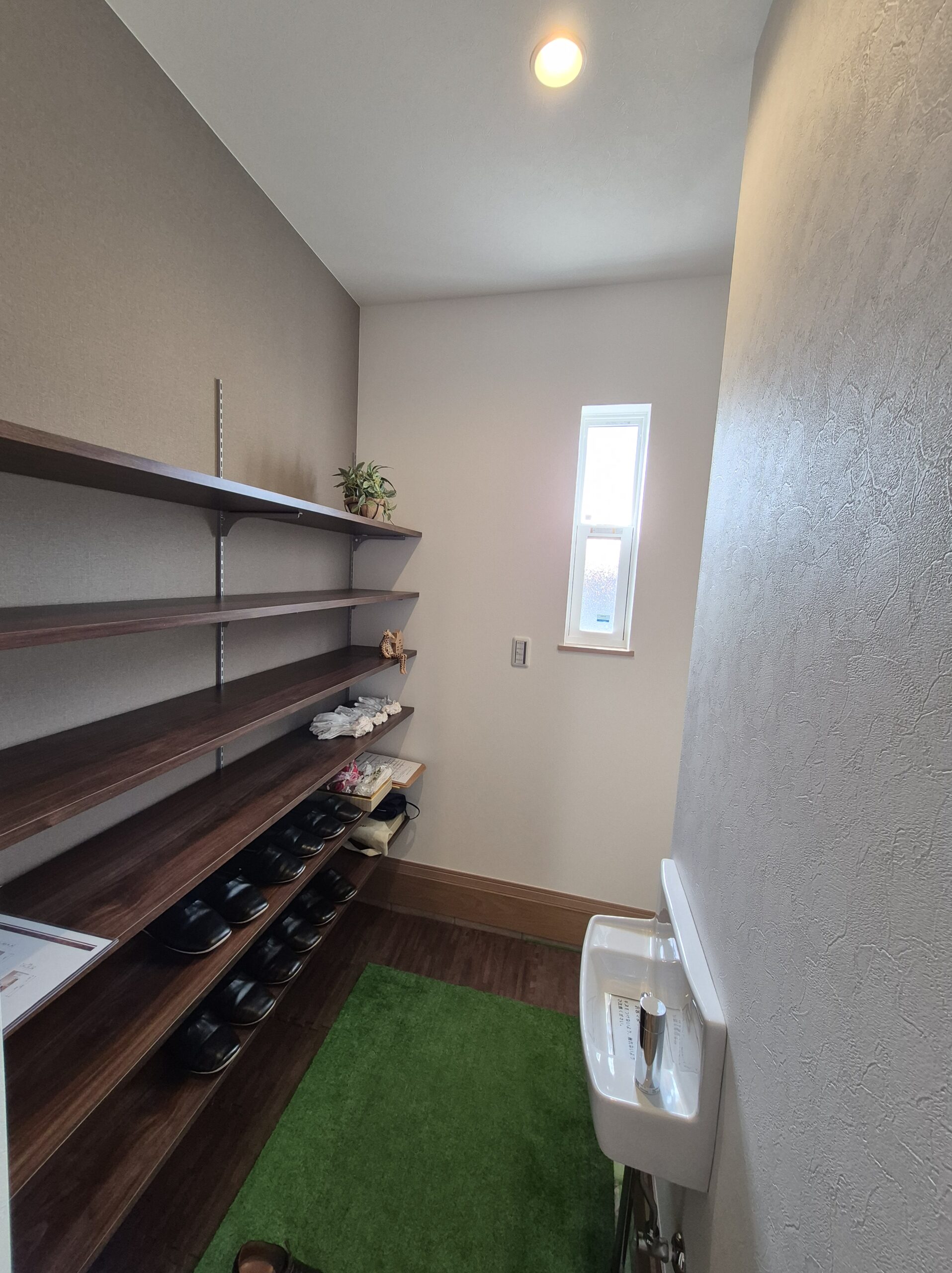 玄関とシューズクローク両方から上がれるように設計。 手洗い器も付けて帰ってきてすぐに手を洗える便利な空間。 靴もスッキリ片付きます!