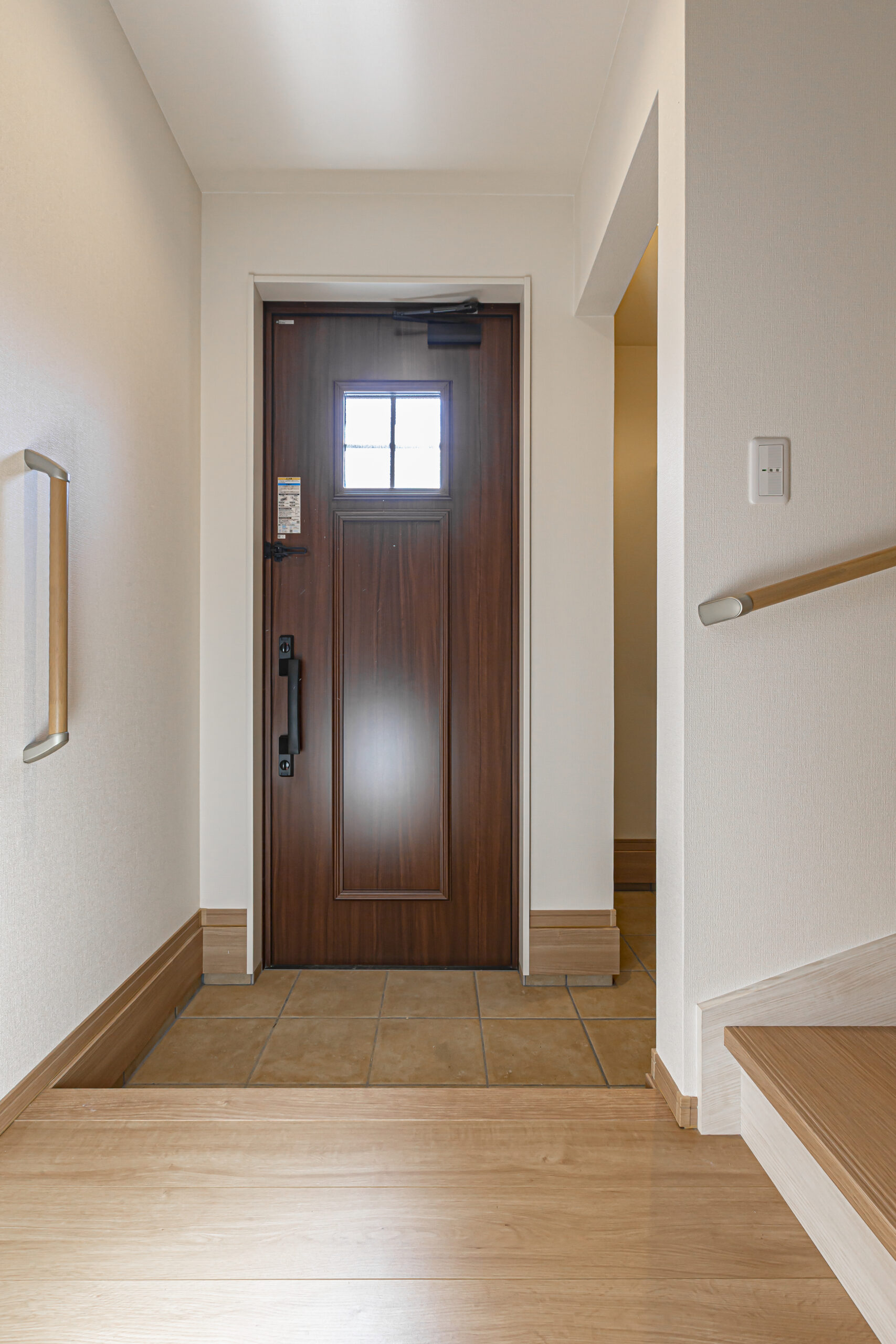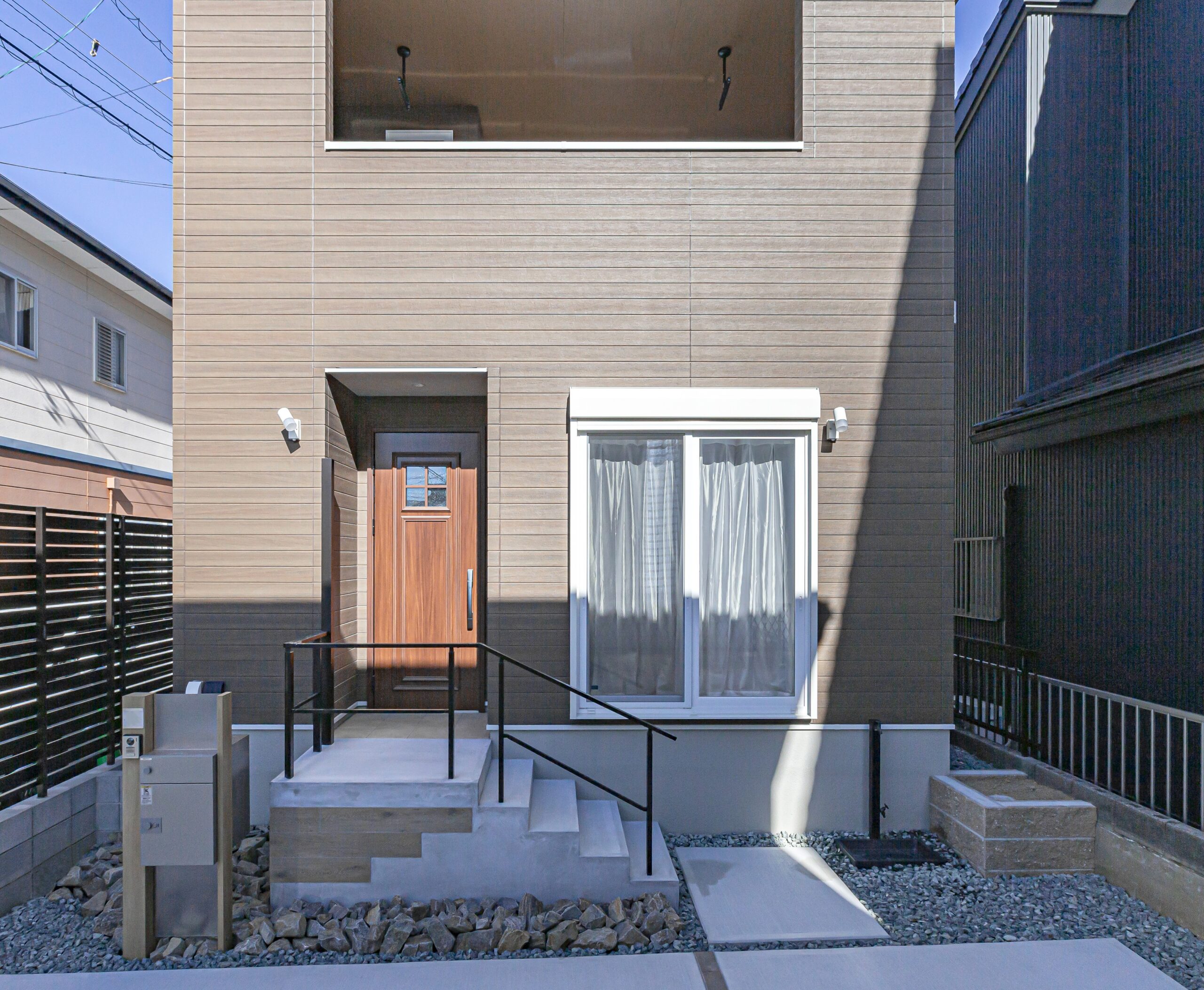 ナチュラルな色合いの外壁に木目の玄関ドアがアクセントに