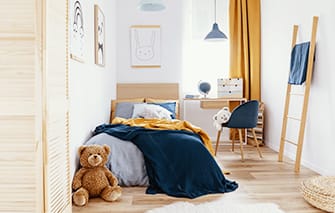 子供部屋 - 間口の狭い家では、無駄をなくし、効率良く部屋を配置していくことが求められます。そこでよく話題になるのが、子ども室の広さです。子ども室は、4.5畳程度あればベッドと机、本棚がおけるスペースが確保できます。