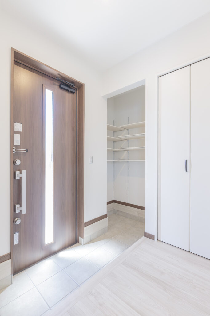 玄関には土間収納を設け、靴やアウトドア用品なども