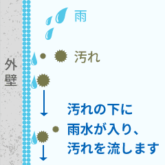 キレイが続く外壁 - 汚れの付着力を弱め、雨水で洗い流す超親水性の外壁が、晴れの日も雨の日も汚れをセルフクリーニング。長期にわたり、きれいな外壁を保ちます。