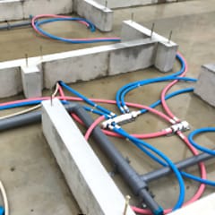 サヤ管ヘッダー工法 - サヤとなる管の中に本来の給水管を通す二重構造を採用。施工が容易かつ鋼管のように継ぎ手がいらないので、漏水リスクを低減し劣化を防ぎます。