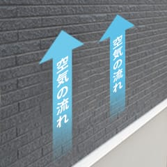 外壁通気工法 - 透湿防水シートで壁を覆い、外壁材との間に外気が流れる層をつくることで壁内の湿気を外部に放出。壁体内の結露を低減します。